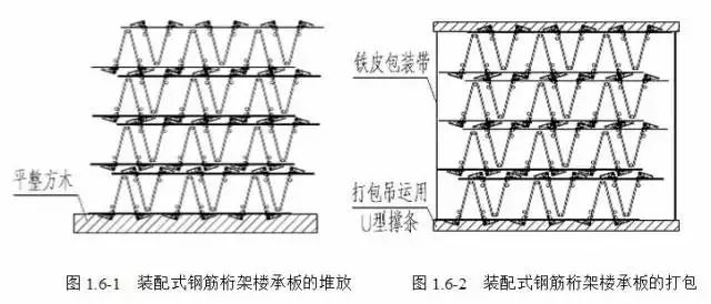 1、鋼筋桁架樓承板應(yīng)遵循相同規(guī)格同垛堆放的原則。堆放時兩塊板正反倒扣為一組,堆放在平整方木上,如圖1.6-1所示。